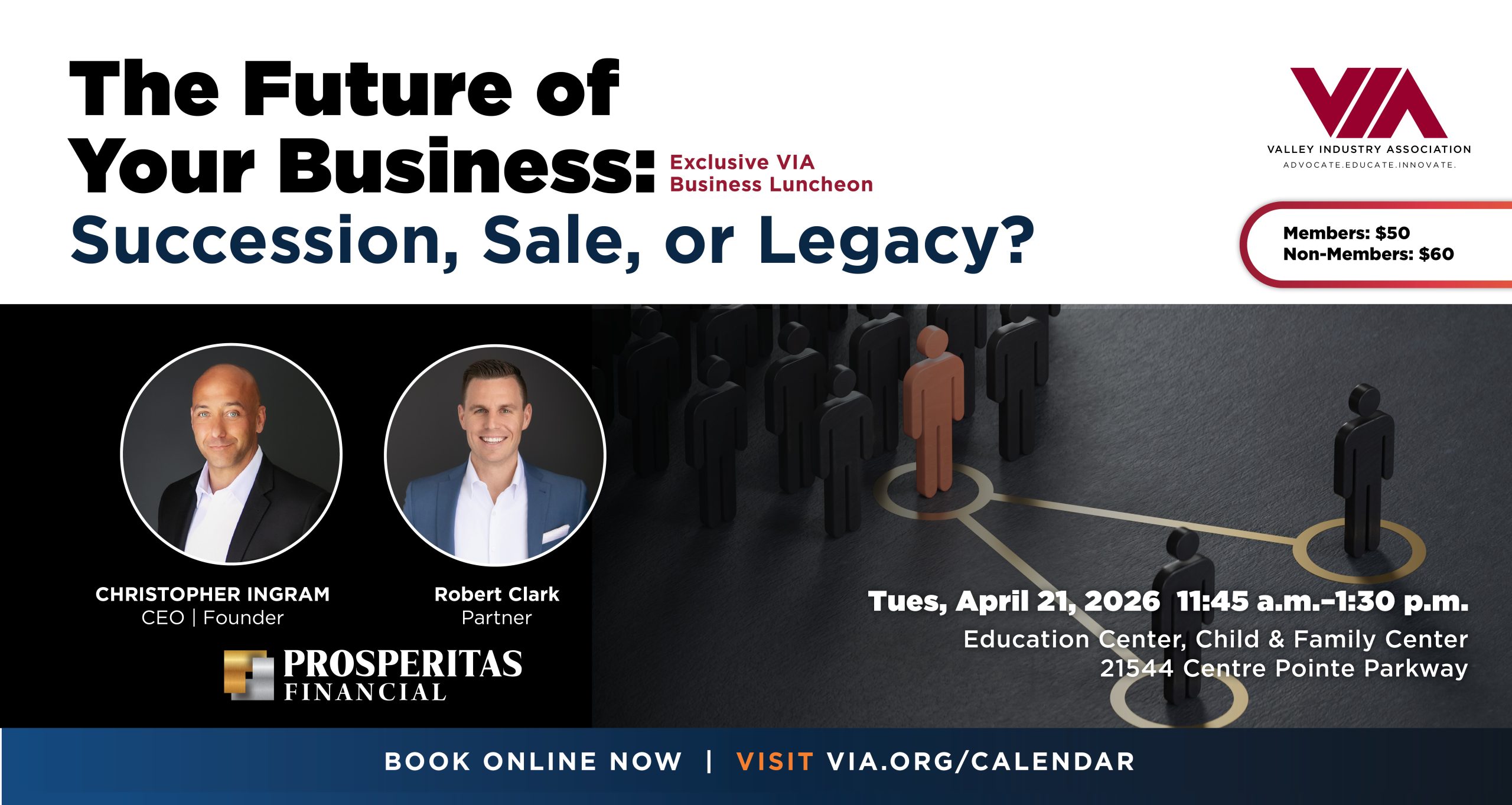 VIA Luncheon – The Future of Your Business: Succession, Sale or Legacy? + Add to Google Calendar + iCal / Outlook export 00 days 00 hours 00 minutes 00 seconds Book Event VIA Member $50.00 Available Tickets: 66 The “VIA Member” ticket is sold out. You can try another ticket or another date. Non-Member $60.00 Available Tickets: 66 The “Non-Member” ticket is sold out. You can try another ticket or another date. Next Date Apr 21 2026 Time 11:45 am – 1:30 pm Location Education Center at Child & Family Center 21544 Centre Pointe Parkway, Santa Clarita, CA 91350 Organizer Kathy Norris Phone 661 294 8088 Email kathy@via.org Website https://www.via.org/ Share this event